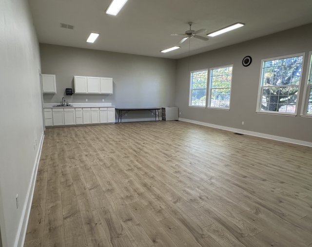 For smaller events we have the beautifully remodeled CLASS ROOM that is over 700 sq foot. Perfect for meetings, classes or smaller events with up to 50 guests. Equipped with a sink and counter. Use of tables & chairs are included with your rental. Great for a baby or bridal shower, kids birthday party, wine and canvas party (projector available for rent for tutorial), small banquet, etc.